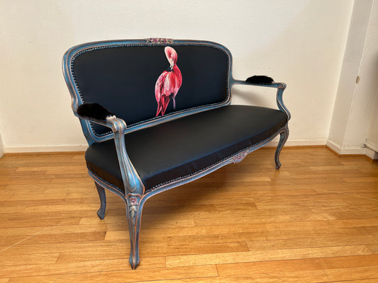 Antique Sofa | Re-Designed | Flamingo Set | Black Leather | Decoupage | Mink Armrests | Handmade