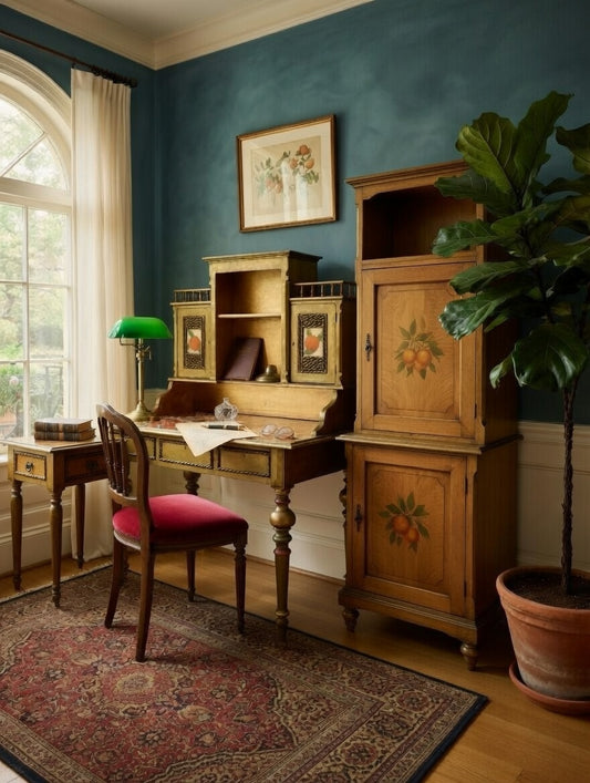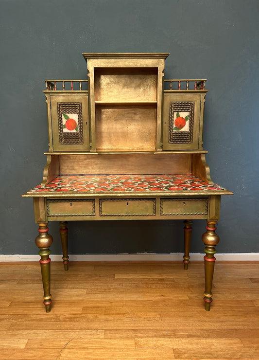 Antique Norwegian Secretary Desk | Restored Gold & Green Fruit Decoupage