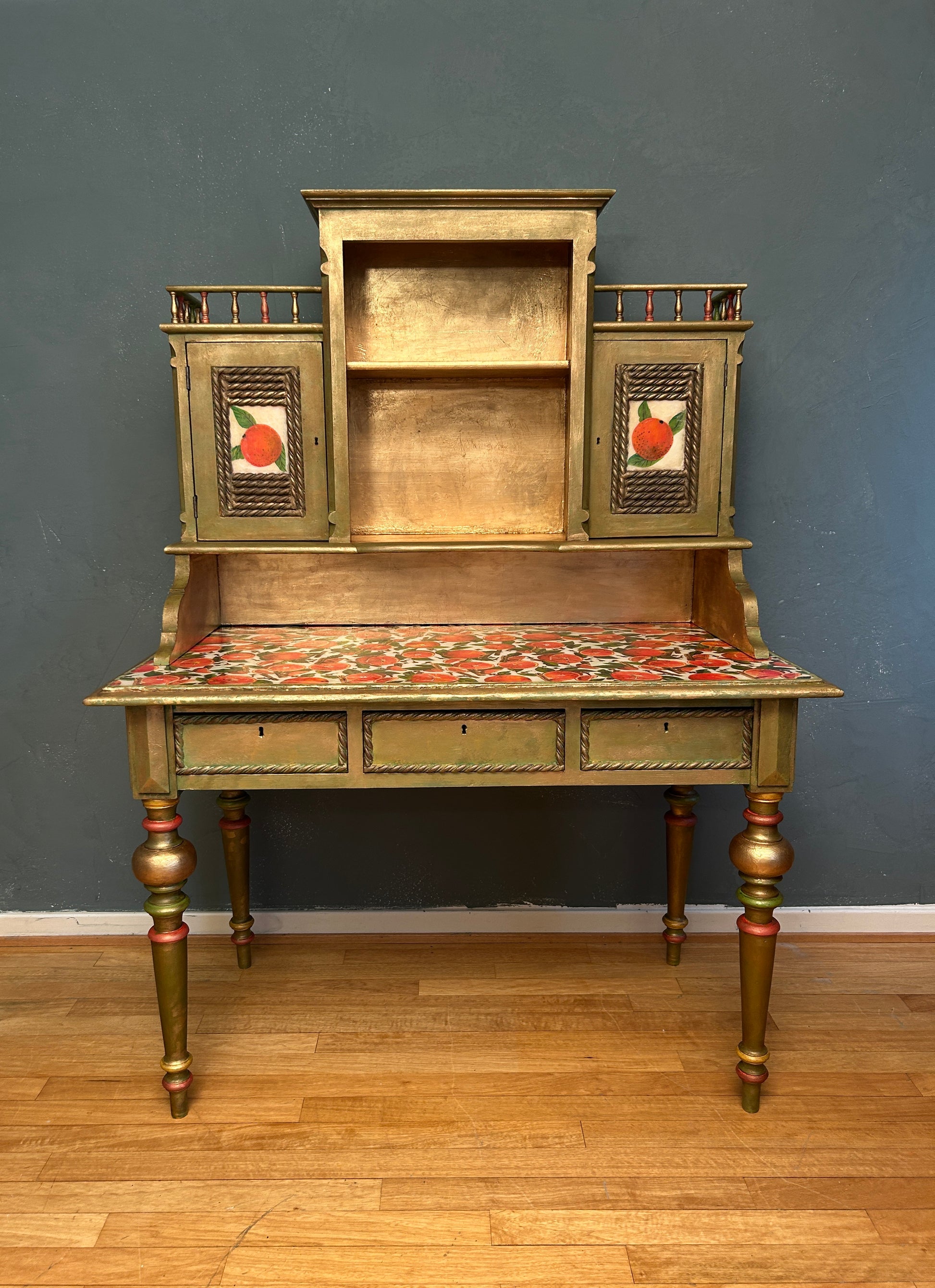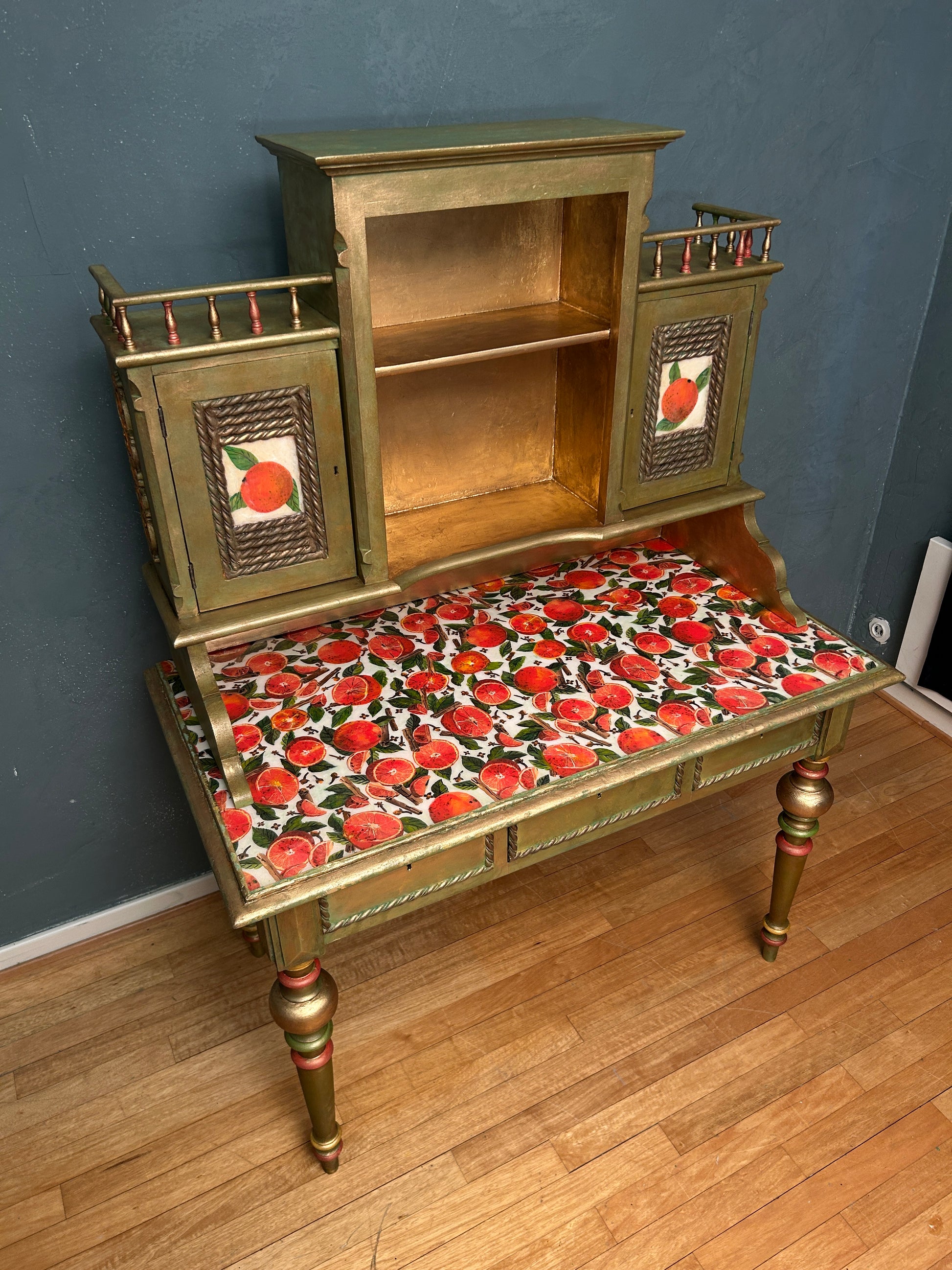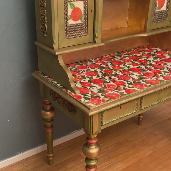 Antique Desk | Re-Designed | Secretary Table | Writing Furniture | Green&Gold Finish | Velvet Interior | Handmade | KiyanStudio