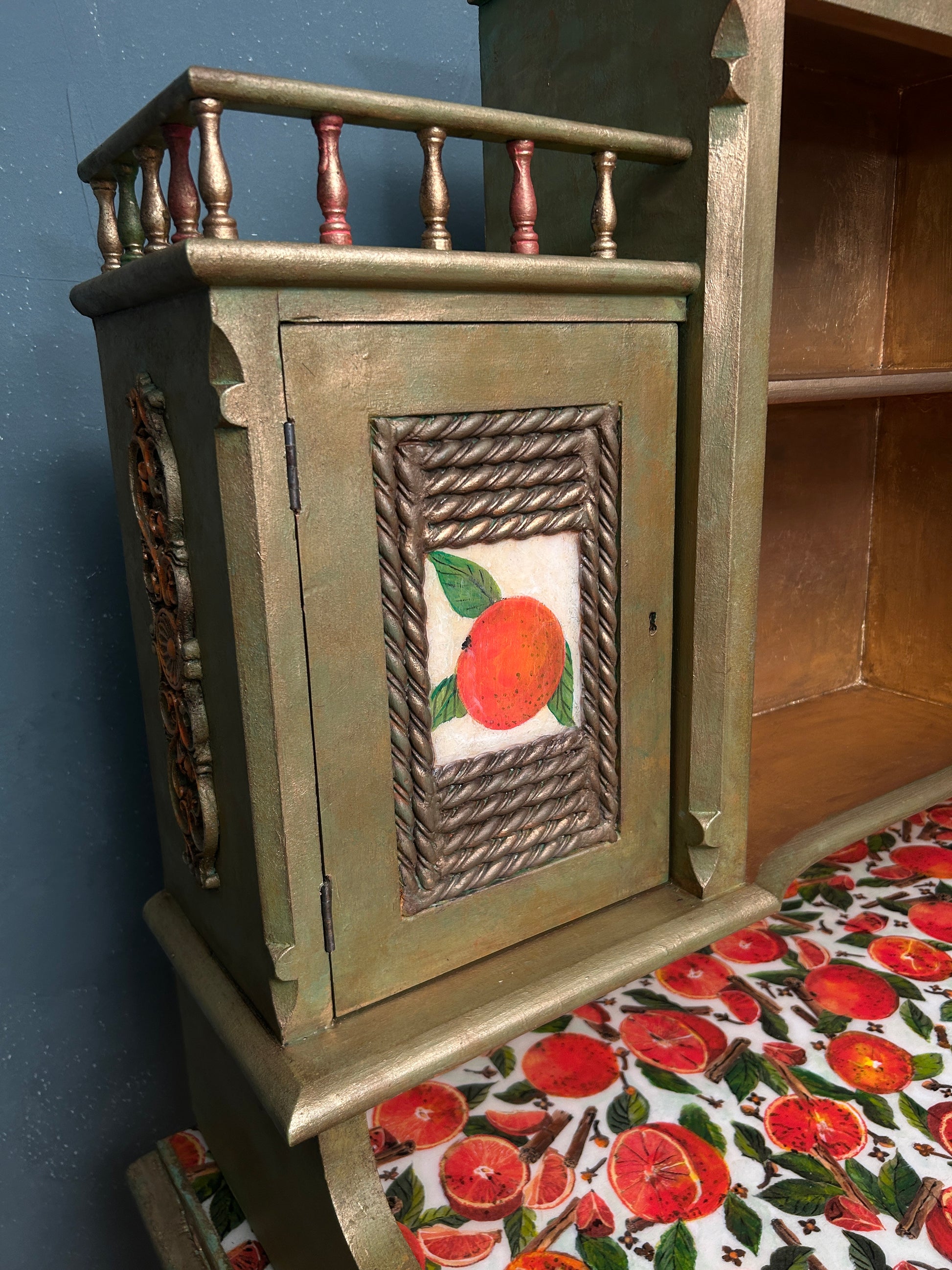 The doors of the secretary are decorated in the same decoupage technique and also protected with liquid glass.