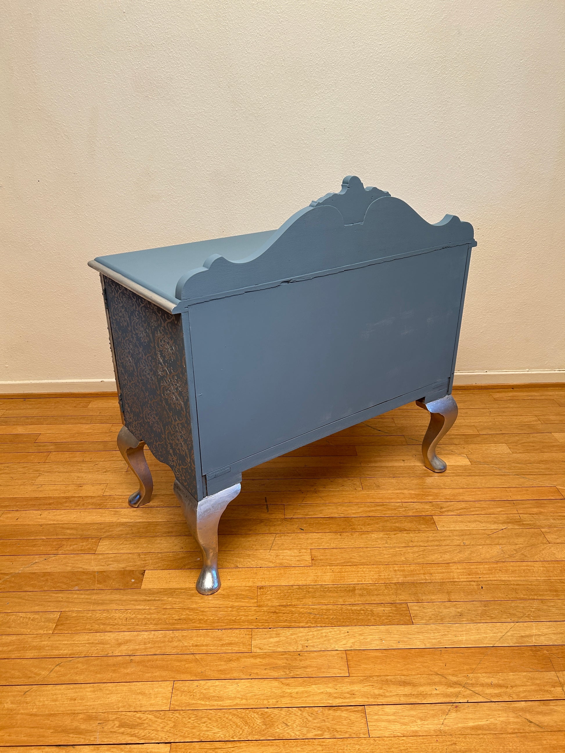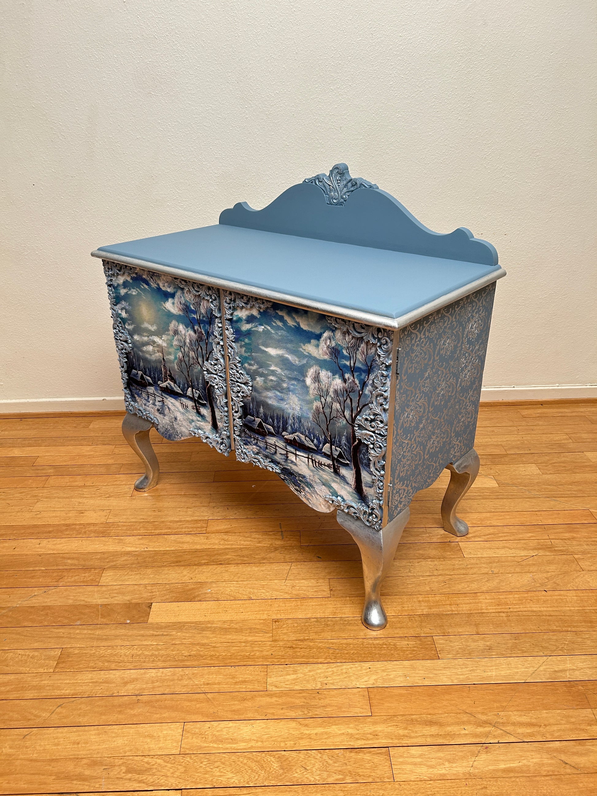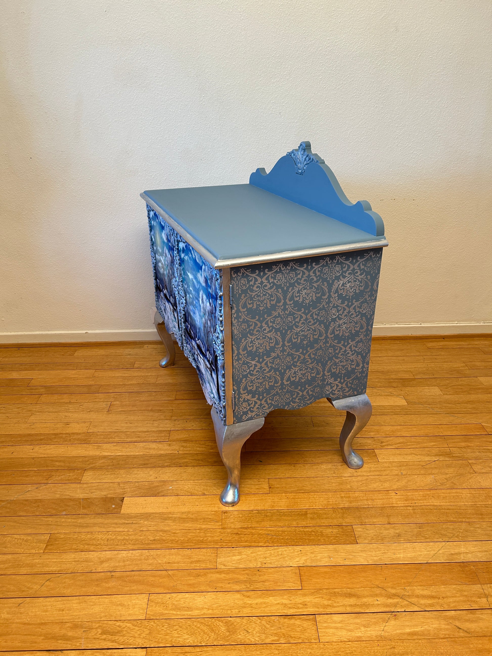 The dresser is crafted in an uncommon technique — fabric decoupage using cotton, giving it a soft, tactile charm.