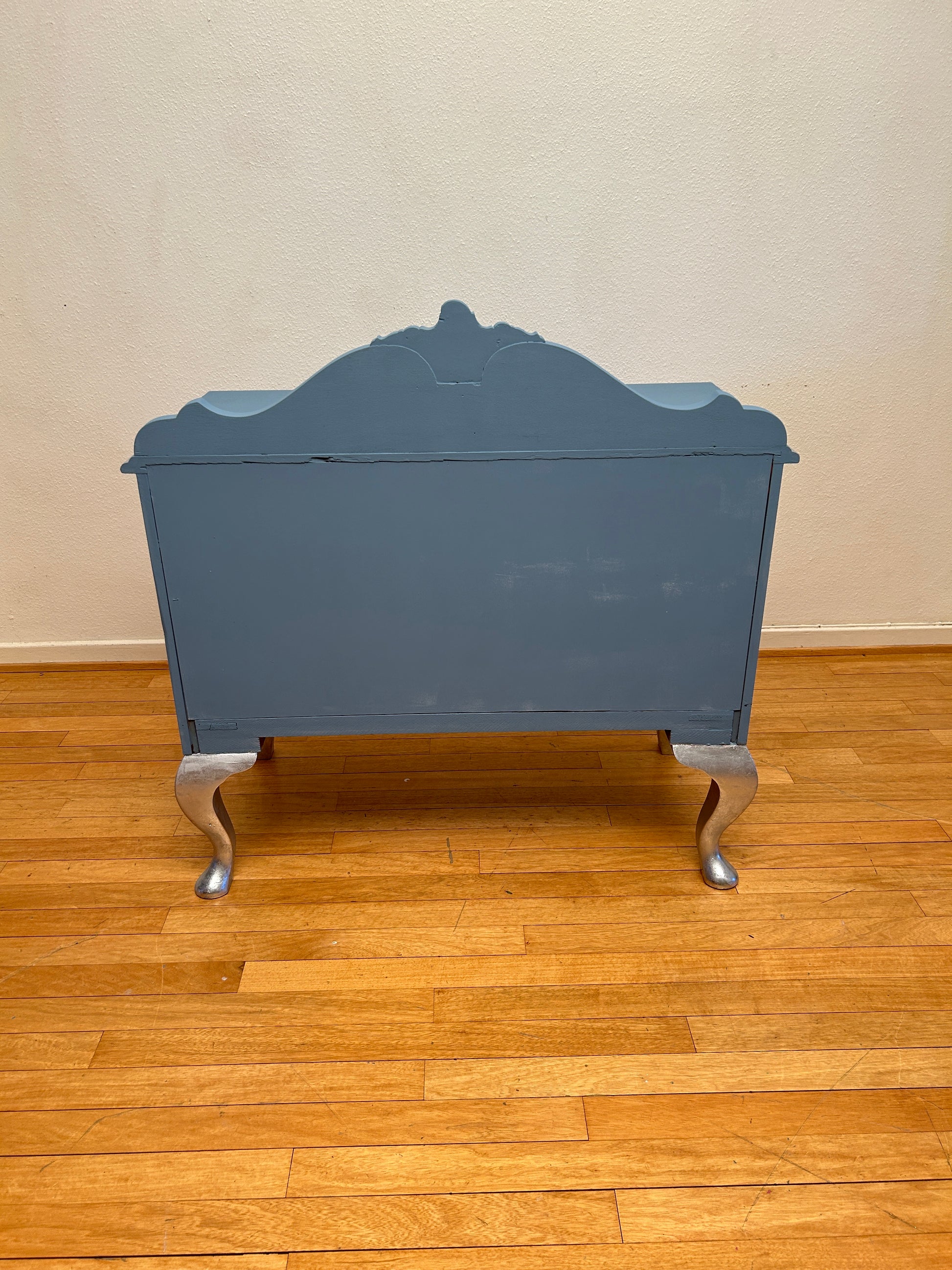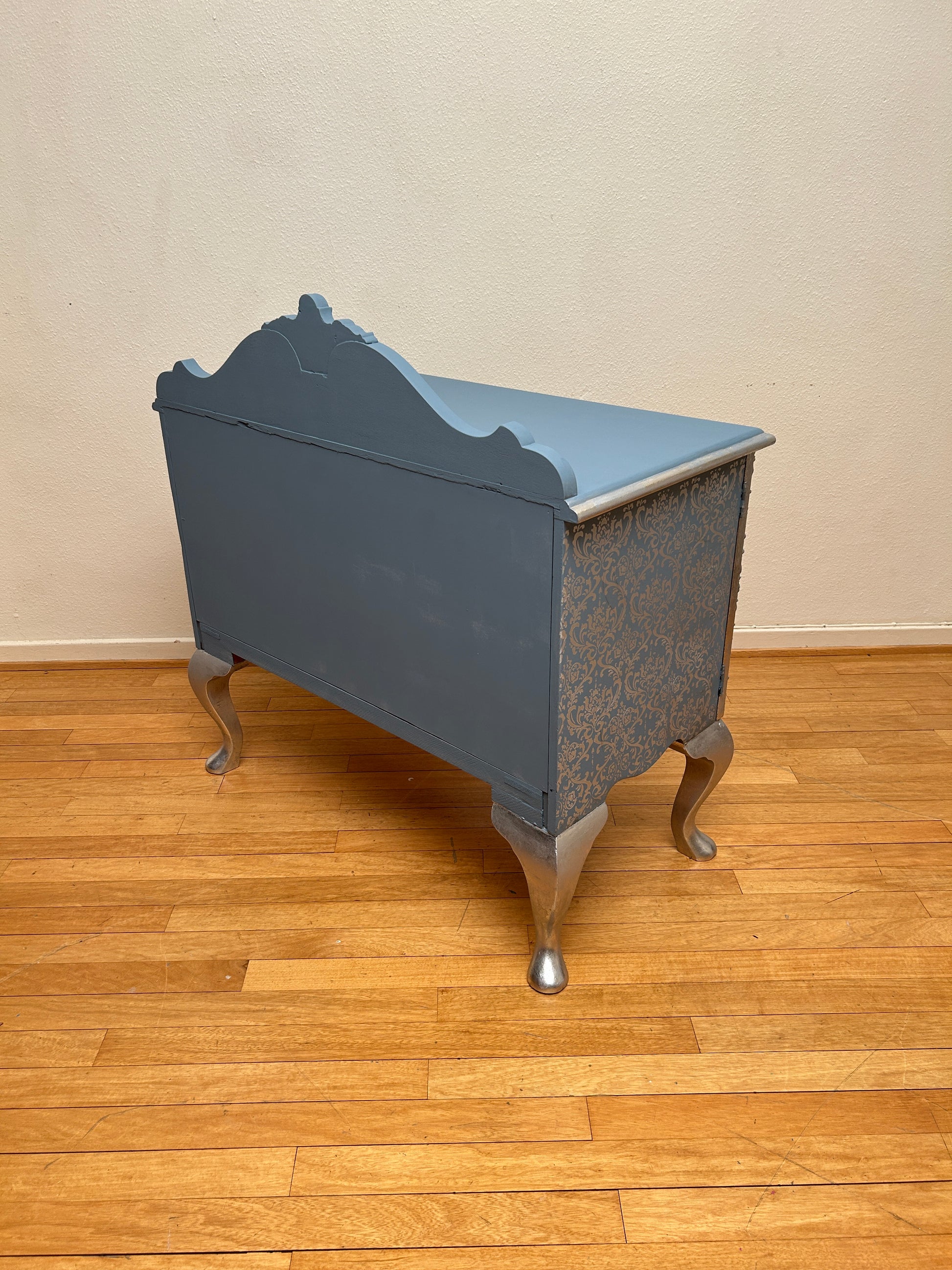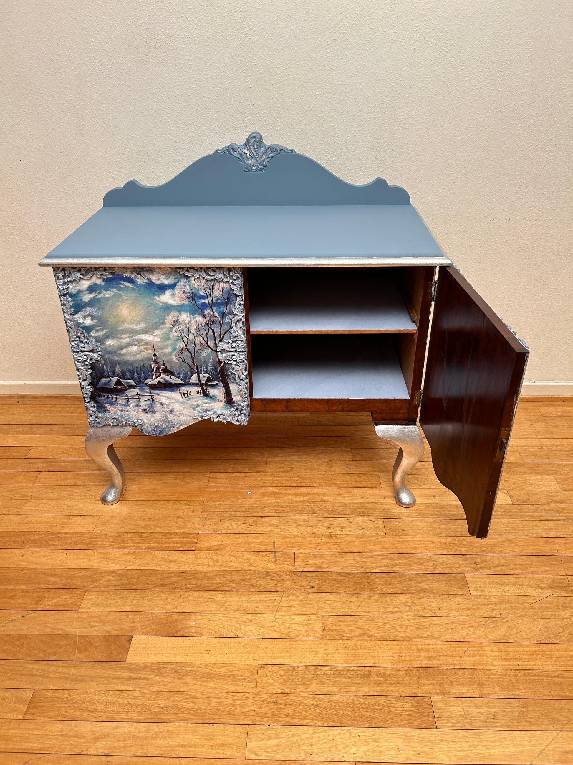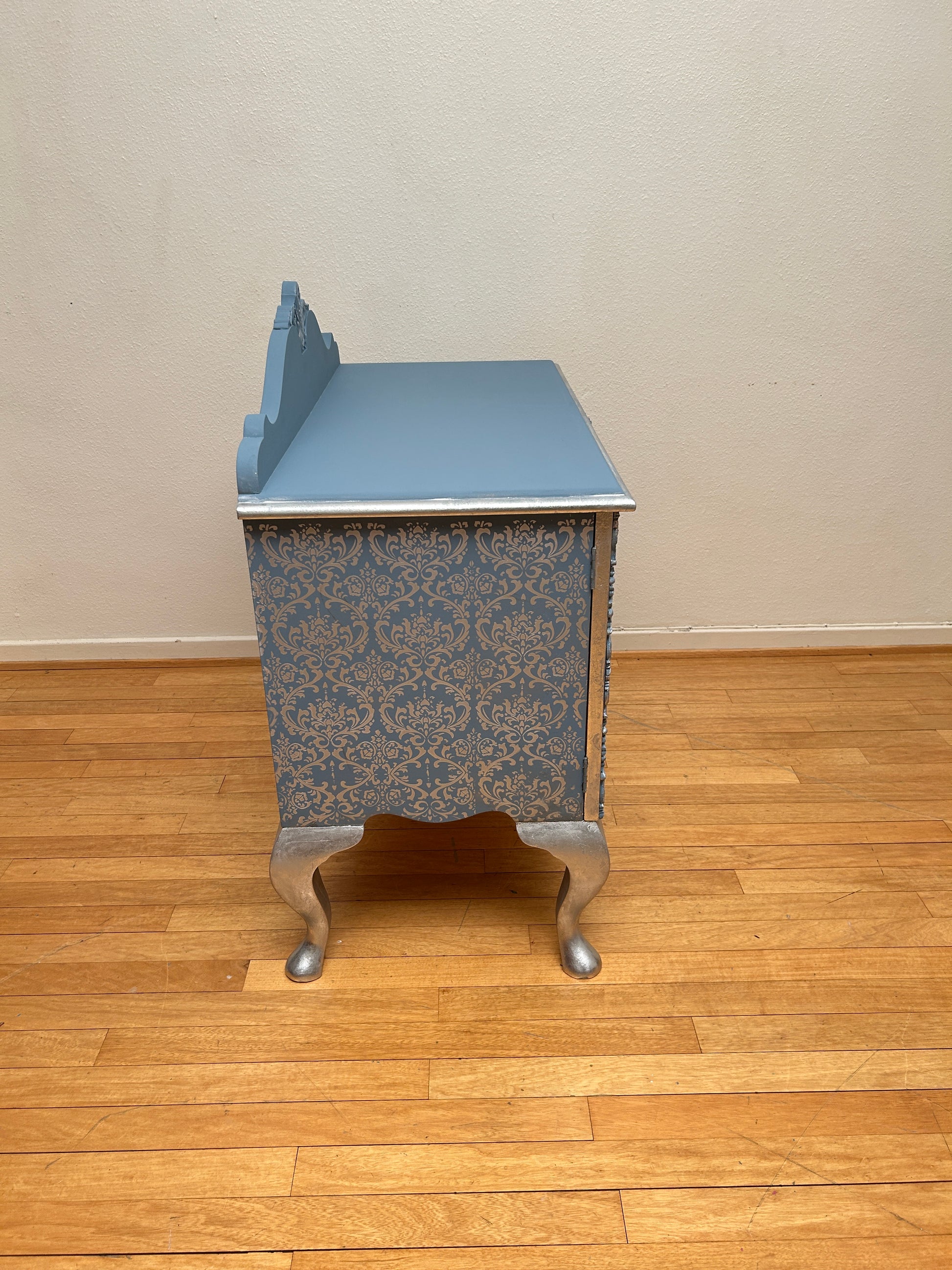 The dresser is crafted in an uncommon technique — fabric decoupage using cotton, giving it a soft, tactile charm.