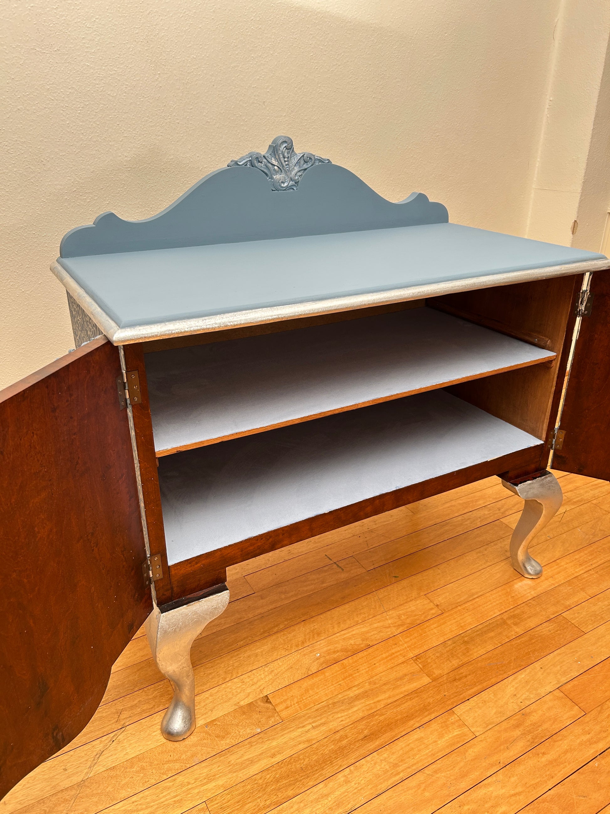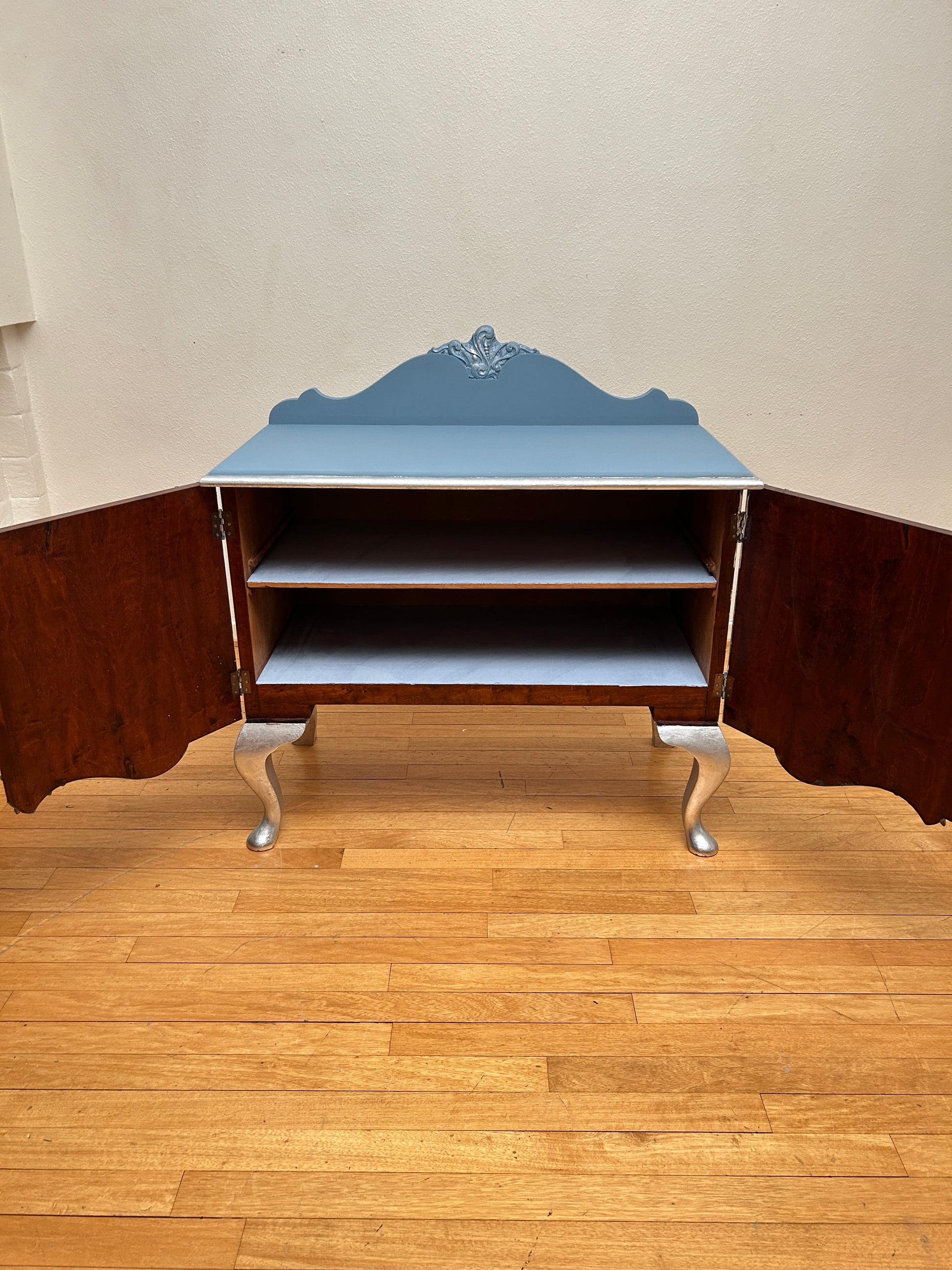 Inside, there are  two shelves lined with pale blue velour, soft as snow under morning light.